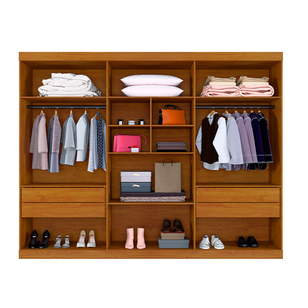 • Puxadores madeirados;• Corrediças Telescópicas;• Cabideiro de alumínio;• 100% 15mm;• Kit de pés inclusos;