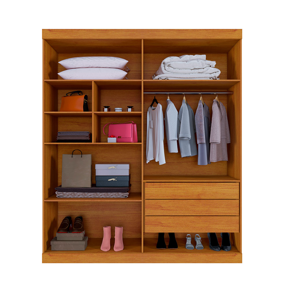• Puxadores madeirados; • Corrediças Telescópicas; • Cabideiro de alumínio; • 100% 15mm; • Kit de pés inclusos;